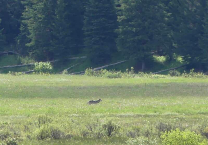 The first two mornings we rose early and drove into the Park soon after 6am, just as the sun was climbing above the rim of the mountains. This was also a good time for seeing wildlife before it got too busy; dawn and dusk being the best time to see wolves in particular. We were very fortunate to see three wolves, albeit from a distance and there's only one photo below as Paul's camera struggled without a long enough lens. On each occasion the kindly local people allowed us a closer view through their scopes.